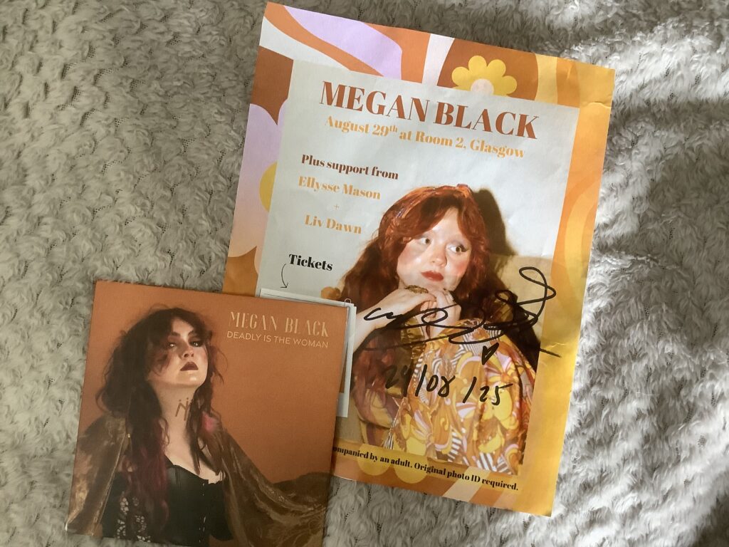My only regret was not seeing if there was a Megan Black t-shirt at the merch stall in my size. I did walk away with some mementos of the night – the last copy of Megan’s CD from the stall and a signed mini poster of the show.