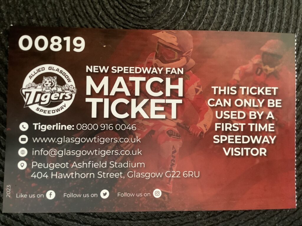 About a month ago, the Glasgow Tigers FB page (I have been following the Tigers page for YEARS) had posted about offering free tickets to those who’d never attended a match to go along and see what speedway was all about. Hell yes, I thought! I applied for two tickets and I was offered them. Only problem, the first meeting I could use the tickets for was the night of the Megan Black gig. The next opportunity after that was Sept 12th – it got called off due to bad weather. The next was Sept 19th – the night of Zoe Graham’s gig at the Hug and Pint. This Tuesday was the first real opportunity we had to go and use the tickets.