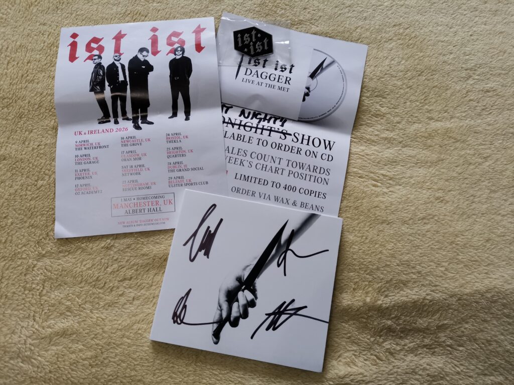 I was in the company of Michelle and we queued after the show for the signing and meet and greet. Michelle had ordered a vinyl copy of the album but had decided not to bring it with her. I got a CD copy so I could bring it along with me and have it signed by the guys. With the few quid I had left I bought a pin badge which is awesome and almost looks like a coffin shape. I asked if I could have a photo taken with them which they were obliging with. I look like a serial killer and fat as fuck (which I am) but hey ho. It’s a memento.