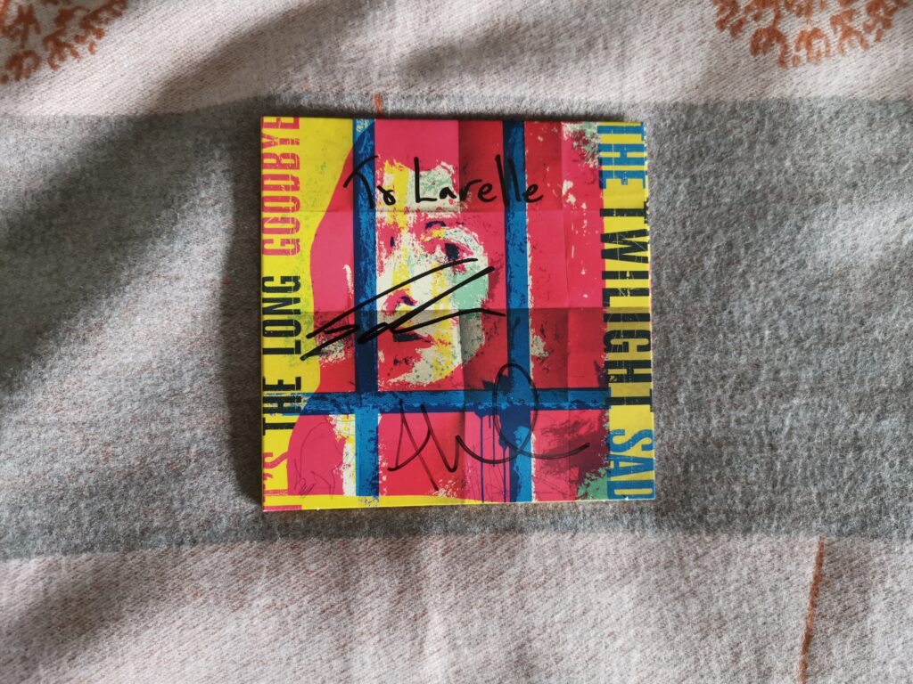 After the set, the store staff had us queue back outside for the signing session. Of course that was when the weather decided to be shitty once more and the rain fell quite a bit heavier for a period there. As I got closer to the front of the queue I had no idea what I was going to say to the guys. I’m such a new fan – so that’s basically what I said … a very new fan and that I couldn’t wait to see them again at the Barras next month. James asked me if I had been to a gig there before. I said I had. “Great. Then you know what a great venue it is.” I’m starting to think I should have a piece of paper with my name spelled out on it because I feel so awkward having to spell my name out. James was very attentive as I spelled it out to him and he made no mistakes, bless him. I love it when bands are happy to dedicate and personalise signings.